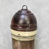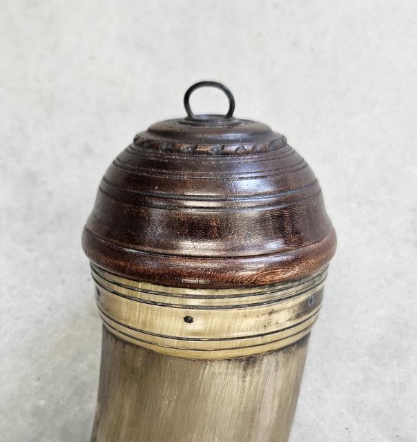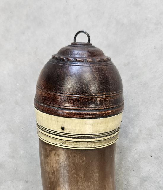 Late Philadelphia Screw-tip Horn w/Dark Red Painted Butt: The Late Philadelphia horn is always a slim and graceful style. These circa 1790 to 1810 horns are always a fine and sophisticated appearing item. This horn has an internal screw tip with applied collar to reinforce the spout of the horn and provide a strap retention bulge on the spout end. The cherry wood stopper in the spout is taken from an original stoper found in one of these Late Philadelphia horns. The turned maple wood butt is painted dark red and has a cherry wood button that is friction fit to the tapered hole in the butt. This button is dark red also. The authentic design of this horn is taken from horns in Chapter 2 of my book "PA Horns of The Trade".