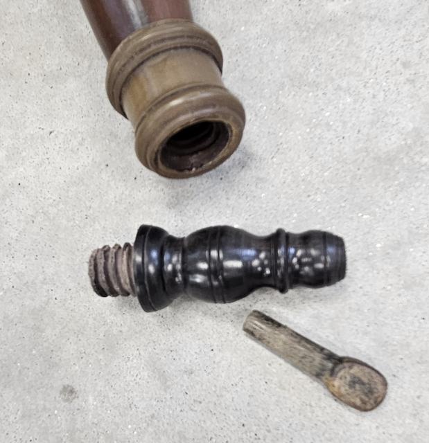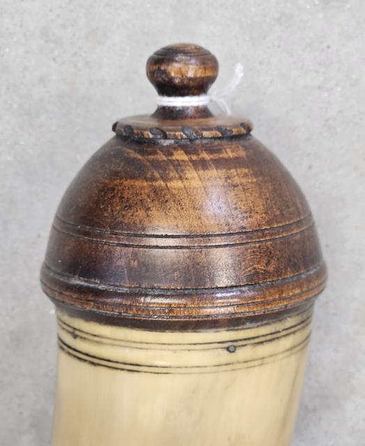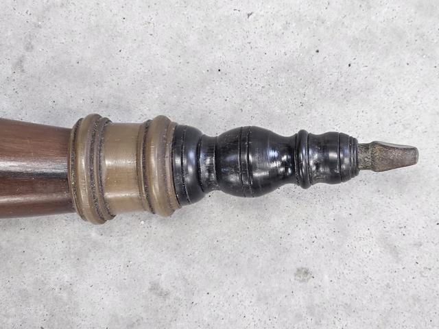 Lehigh/Nothampton Style Screw-tip Horn: This Lehigh / Northampton horn is a replica of Horn #31 from my book and is one of my favorite Lehigh horn styles. It has a natural black horn internal screw tip, with a caramel colored applied collar. The butt is turned from maple and has an integral button for strap attachment. There is a simulated turned band in the upper end of the horn just below the butt.