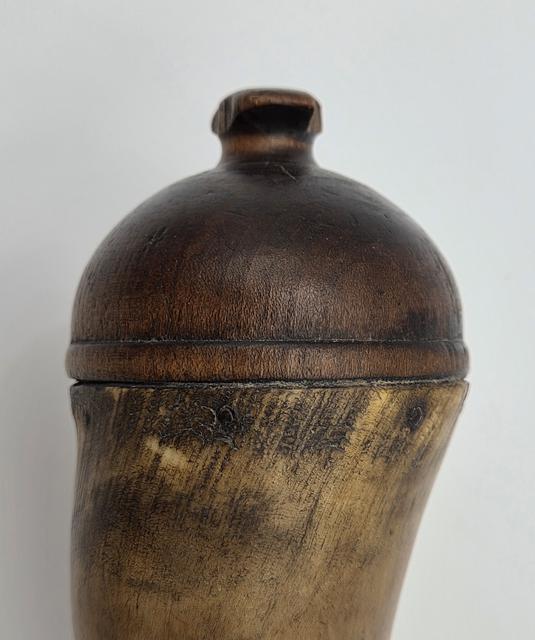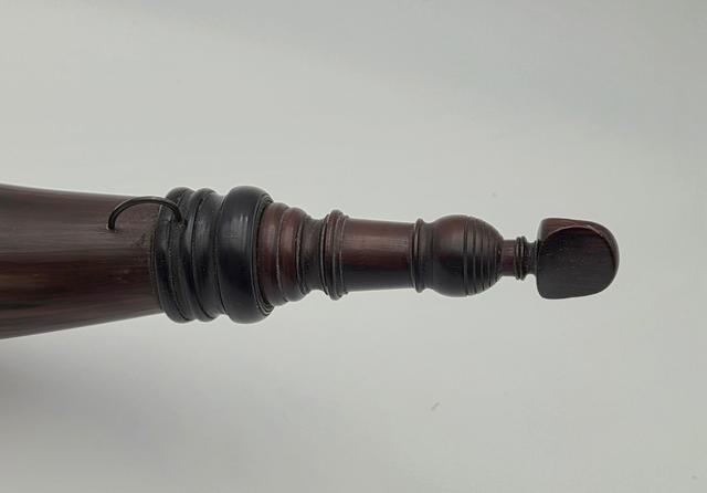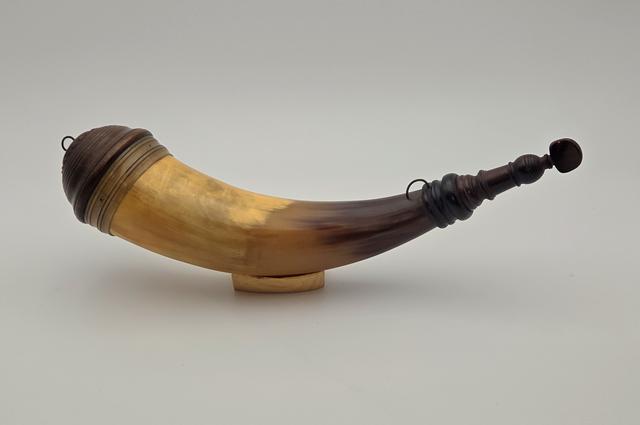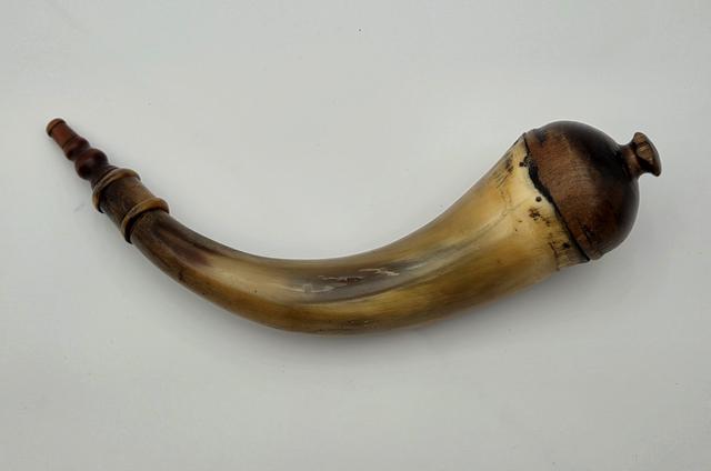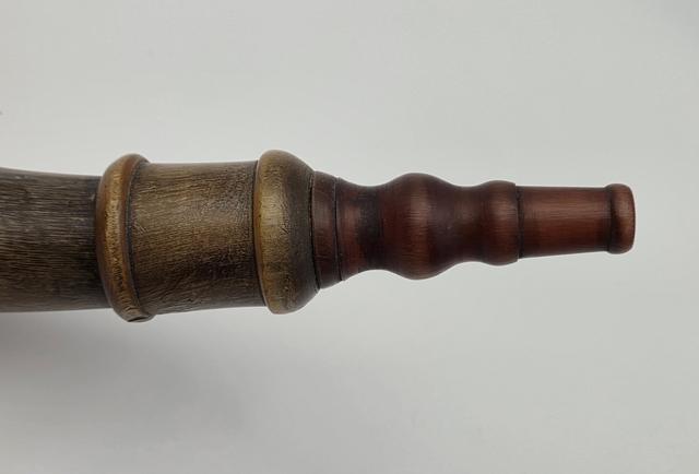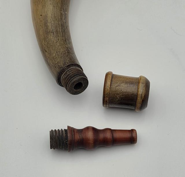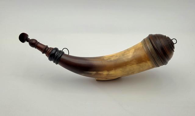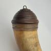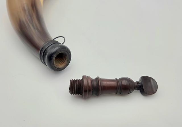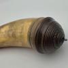 Early Philadlephia Style Screw-tip Horn w/ Horn Band: This replica Early Philadelphia screw-tip horn has a neatly turned cherry wood butt with extra decorative grooves and rope carving as seen on several originals. There is a horn band just below the butt at the top end of the horn which contrast in color with the golden/brown body of the horn. The horn surface is scraped to a finish as found on the originals. The applied horn collar and "pawn-shaped" screw tip are cleanly turned match originals.