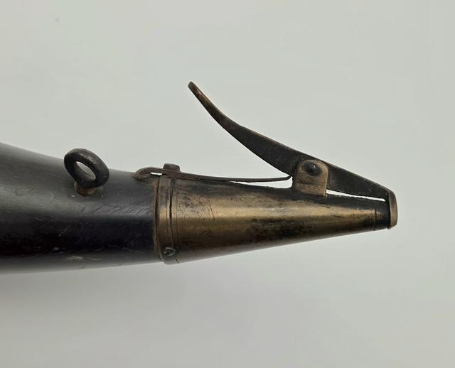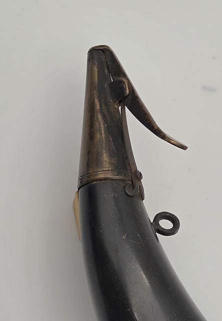 Excellent Condition American Military Contract Horn: This is a fine condition U.S. Contract pattern military contract horn with the spring-loaded brass spout and screw-out knob at butt end. The horn is unmarked and shows light wear. It is all original.